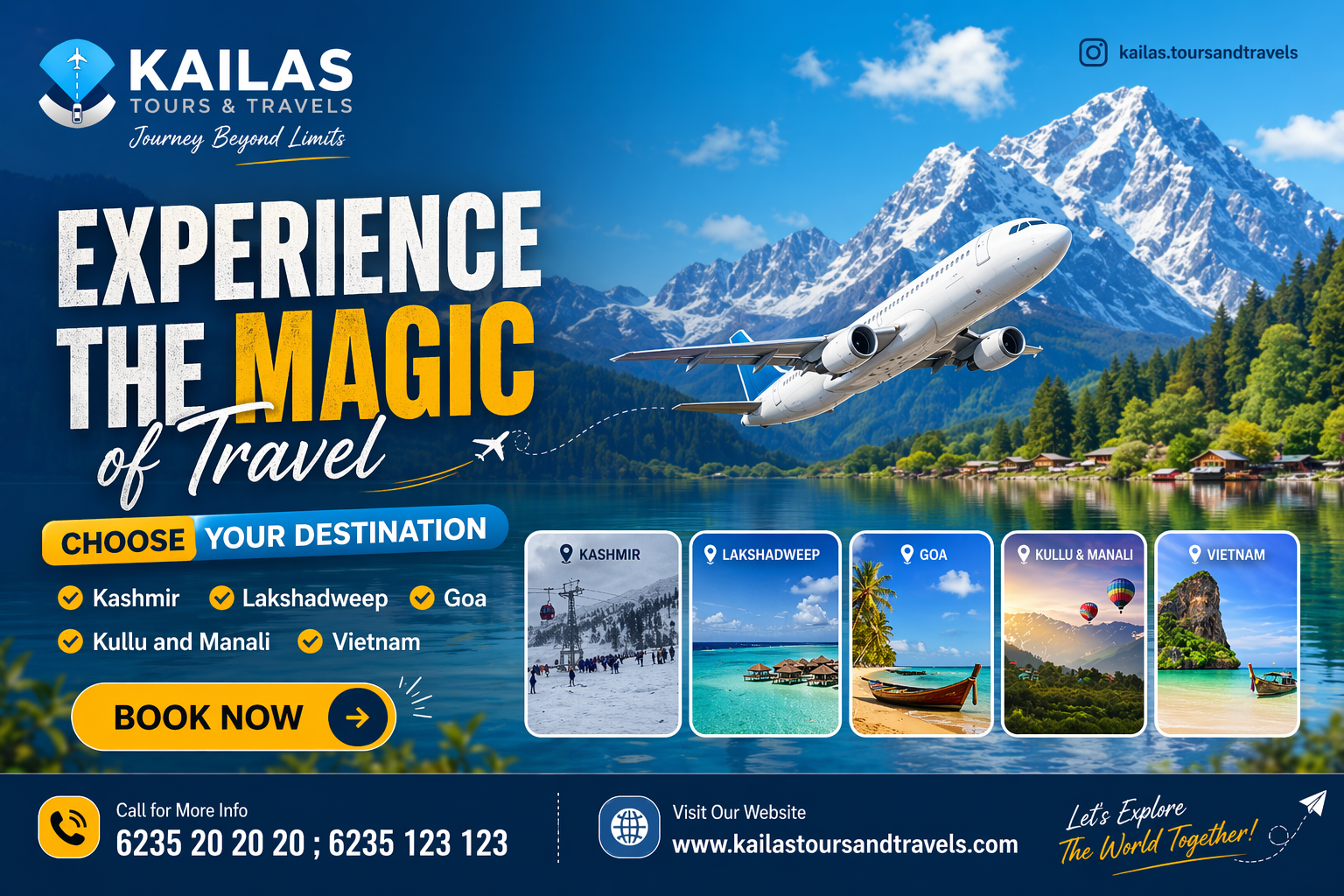 Embark on your dream vacation today. Contact us now and let our expert team craft a personalized itinerary tailored to your preferences. Discover new horizons, create unforgettable memories, and experience the world with Kailas Tours and Travels. Book your next adventure now!.